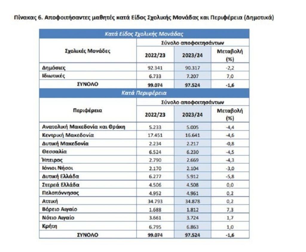 δ) Οι αποφοιτήσαντες μαθητές κατά το σχολικό έτος 2023/2024, σε σχέση με το 2022/2023, παρουσίασαν μείωση κατά 1,6% στα δημοτικά (πίνακας 6).