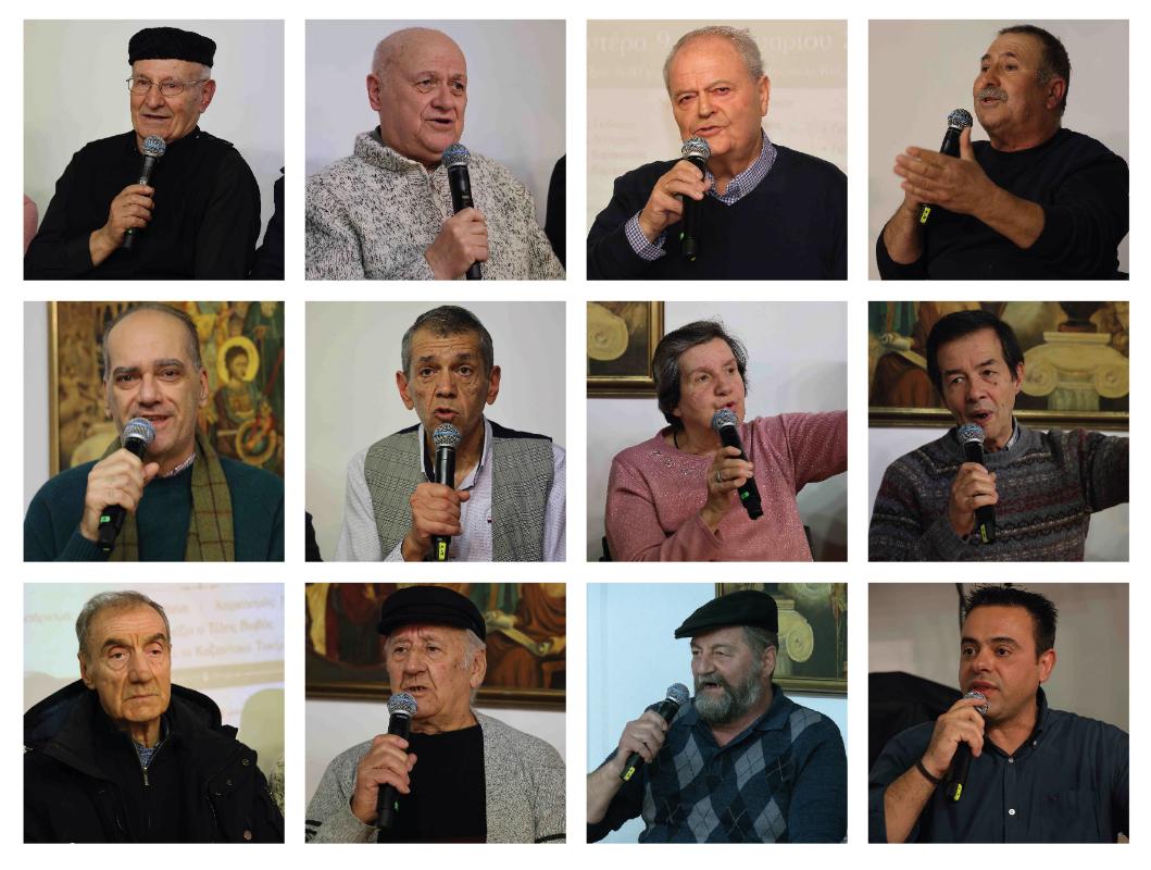 Ειδικότερα, αφηγήθηκαν ιστορίες της Αποκριάς και τραγούδησαν (με αλφαβητική σειρά) οι: Γιώργος Γκιθώνας, Γιάννης Δόδουρας, Κώστας Καραματσούκας, Λάζαρος Κουζιάκης, Θόδωρος Λάκκας, Μανώλης Μαρκόπουλος (Τσιτσιούλα), Ευαγγελία Παρδάλη, Γιώργος Σβώλης, Ντίνος Σπάνος, Τάκης Τζάλιας, Γιάννης Τσιμπέρης, Σάκης Τσολάκης.