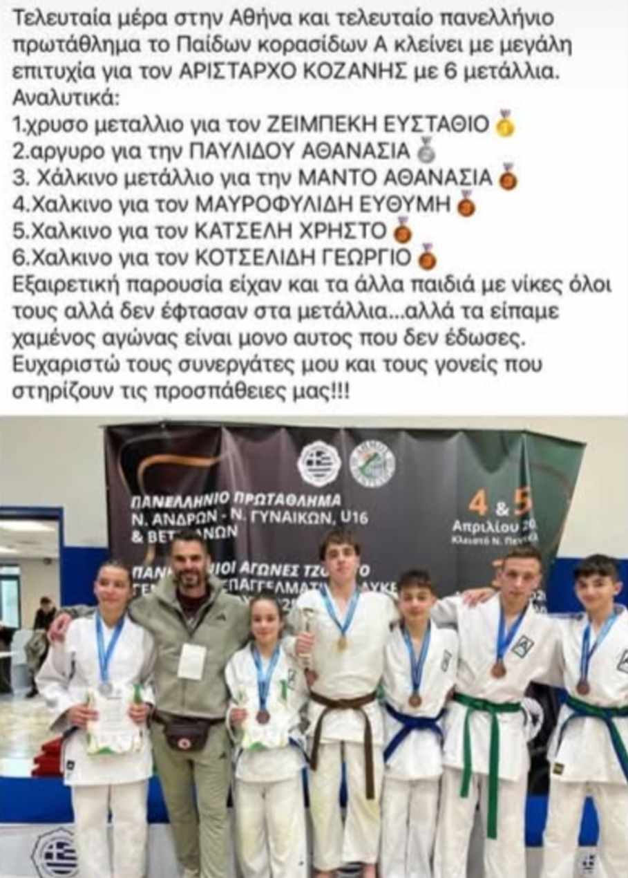 Και οι επιτυχίες συνεχίζονται. Οι μαθητές του Β1 Γυμνασίου του Μουσικού Σχολείου Σιάτιστας «Κωνσταντίνος και Ελένη Παπανικολάου» Κατσέλης Χρήστος και Μαυροφυλλίδης Ευθύμιος κατέκτησαν το χάλκινο μετάλλιο, ο καθένας στην κατηγορία του, στο Πανελλήνιο Πρωτάθλημα Τζούντο U16 (κάτω των 16 ετών).