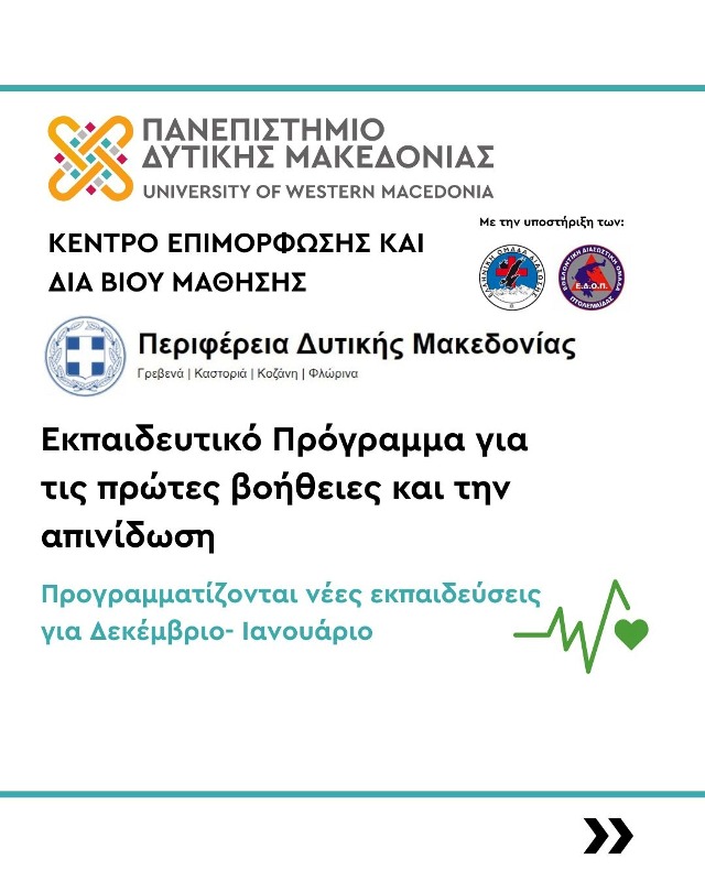 Το Κέντρο Επιμόρφωσης και Διά Βίου Μάθησης (ΚΕΔΙΒΙΜ) του Πανεπιστημίου Δυτικής Μακεδονίας, σε συνεργασία με την Περιφέρεια Δυτικής Μακεδονίας, συνεχίζει δυναμικά την υλοποίηση του Δωρεάν Εκπαιδευτικού Προγράμματος Πρώτων Βοηθειών και Απινίδωσης, με νέες εκπαιδεύσεις που προγραμματίζονται για τους μήνες Δεκέμβριο 2025 και Ιανουάριο 2026.