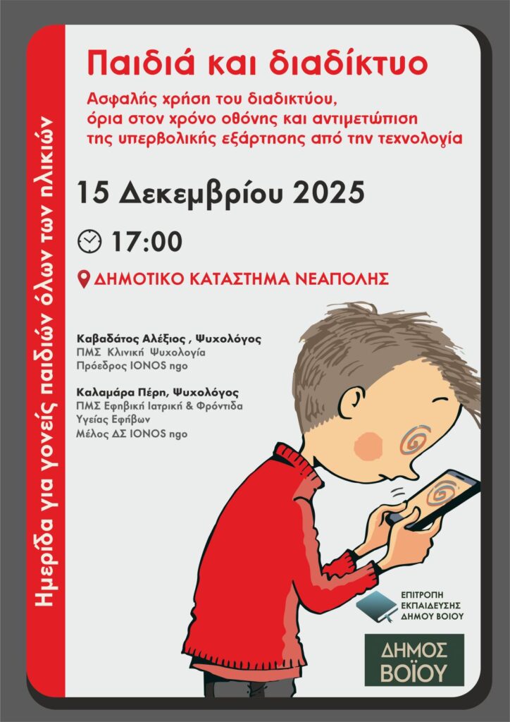Ημερίδα για παιδιά και γονείς για το διαδίκτυο θα πραγματοποιηθεί την Δευτέρα 15 Δεκεμβρίου στις 5:00μ.μ. στη Νεάπολη..