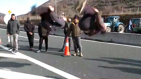 Οι δύο νεαροί, που είναι αθλητές του παρκούρ, δεν χάλασαν το χατήρι της ανταποκρίτριας της ΕΡΤ και έκαναν τα ακροβατικά τους προκαλώντας ενθουσιασμό στους αγρότες