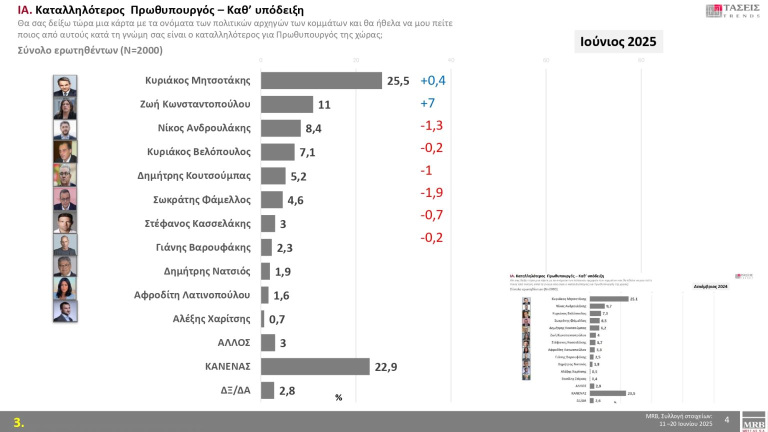 Στον πίνακα που ακολουθεί δείτε πώς διαμορφώνεται στις τάσεις Ιουνίου 2025 της MRB η δημοτικότητα των πολιτικών αρχηγών: