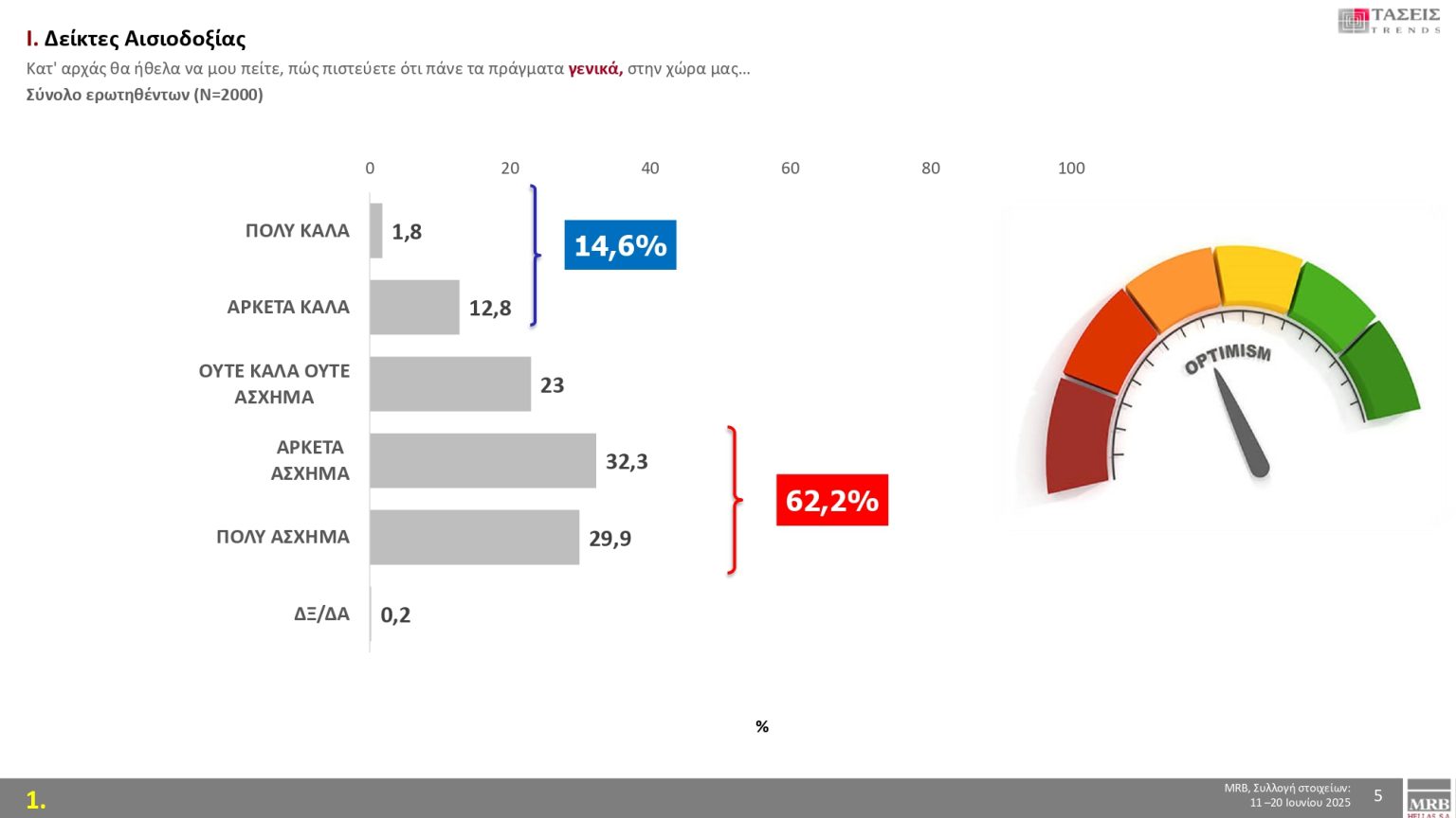 Σε ό,τι αφορά τους δείκτες αισιοδοξίας και συγκεκριμένα στο ερώτημα «πώς πιστεύετε ότι πάνε τα πράγματα γενικά στη χώρα μας», το 62,2 % απαντά «Πολύ άσχημα-Αρκετά άσχημα», ενώ το 14,6 % απαντά «Πολύ καλά-Αρκετά καλά».