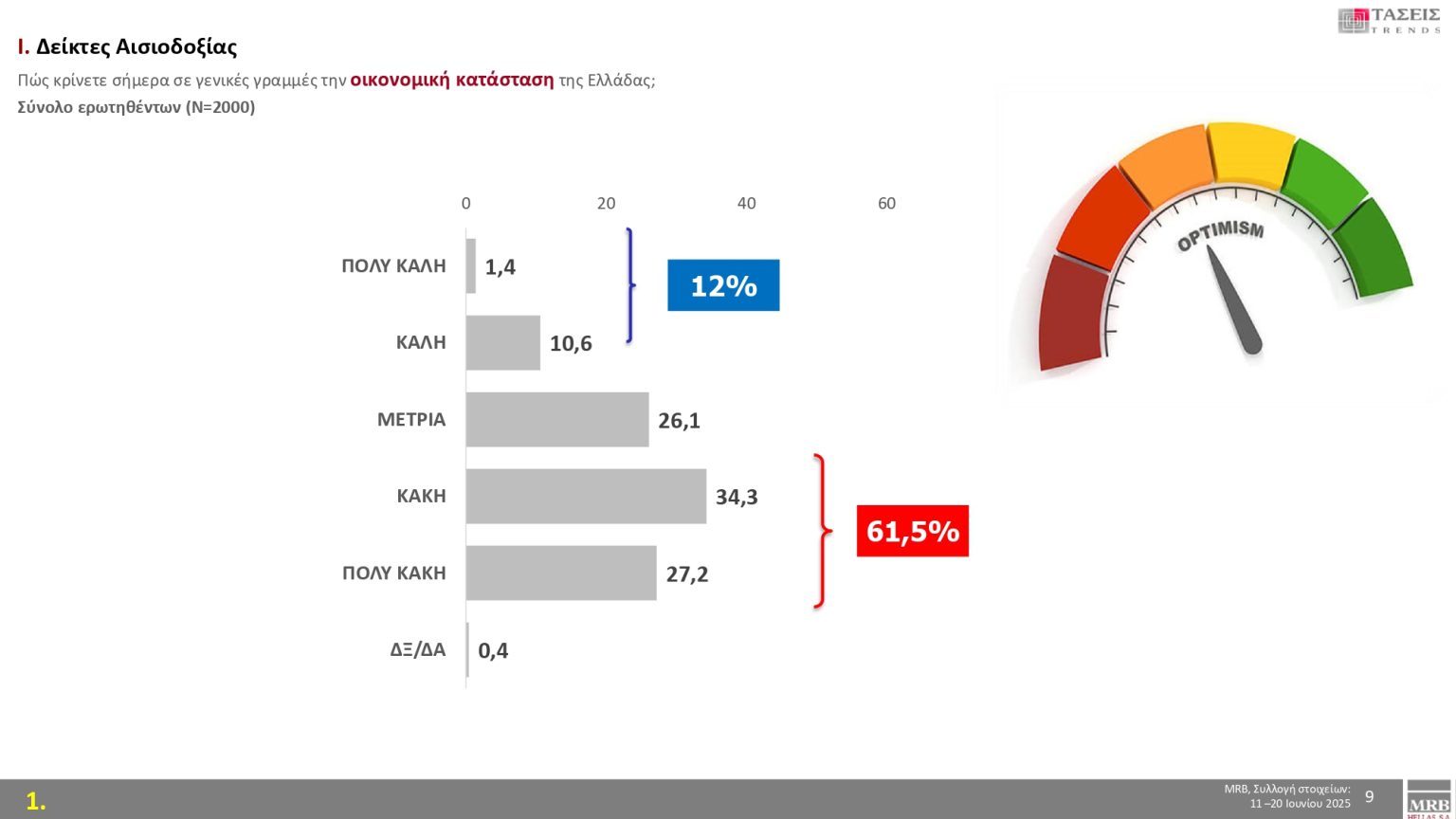 Στο ερώτημα, «πώς κρίνετε σήμερα σε γενικές γραμμές την οικονομική κατάσταση της Ελλάδας», το 61,5 % απαντά «Πολύ κακή – κακή» και το 12 % απαντά «Πολύ καλή-καλή».