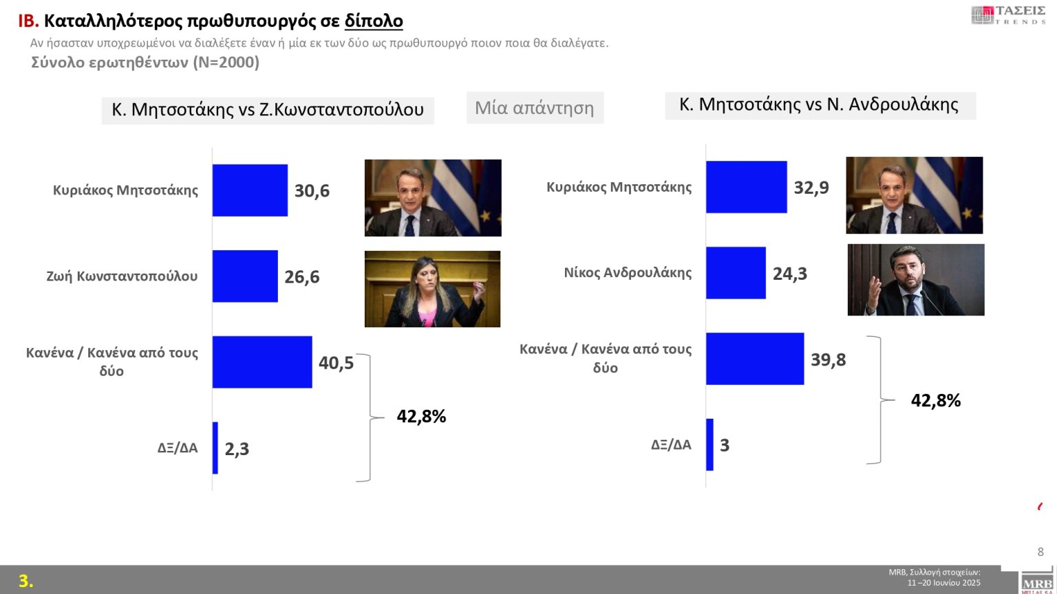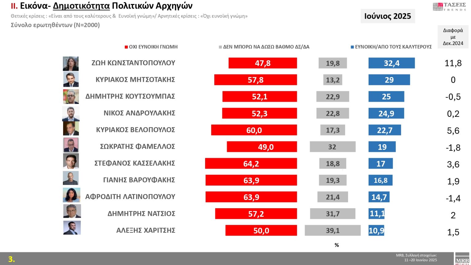 Στον πίνακα που ακολουθεί δείτε πώς διαμορφώνεται στις τάσεις Ιουνίου 2025 της MRB η δημοτικότητα των πολιτικών αρχηγών:
