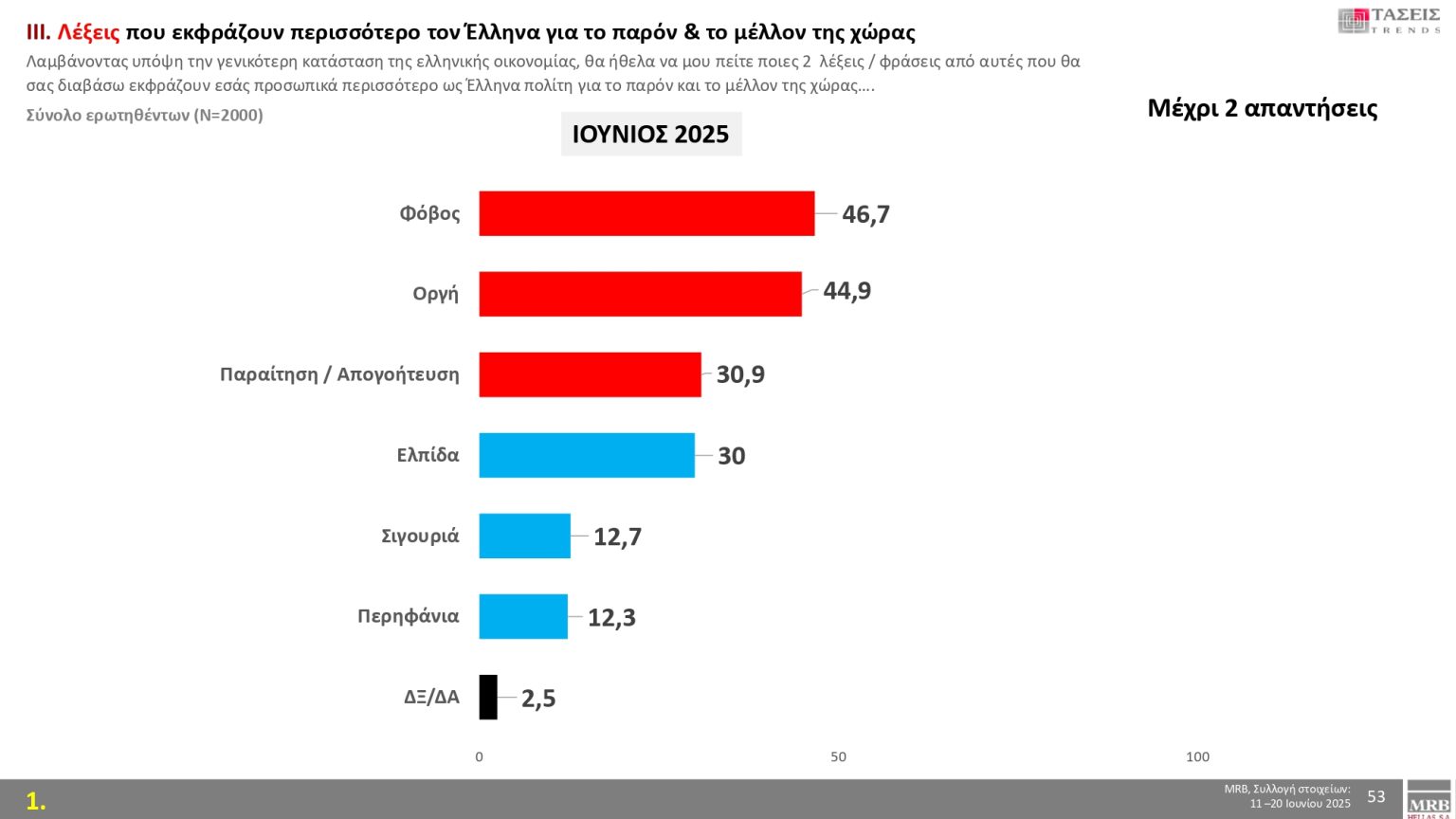 Η λέξη «φόβος» με ποσοστό 46,7 % εκφράζει περισσότερο τους πολίτες για το παρόν και το μέλλον της χώρας, ακολουθούν η «οργή» με 44,9 % και η «παραίτηση/απογοήτευση» με 30,9 %.