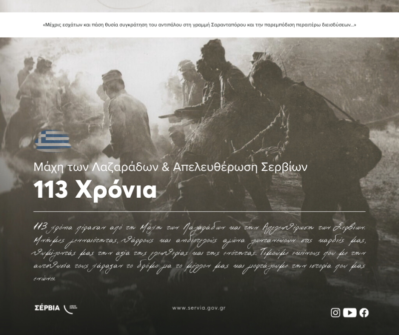 Ο Δήμος Σερβίων σας προσκαλεί να παρευρεθείτε και να τιμήσετε με την παρουσία σας τις εκδηλώσεις που θα πραγματοποιηθούν στις 9 και 10 Οκτωβρίου 2025, με αφορμή την 113η Μάχη των Λαζαράδων και την 113η Απελευθέρωση της πόλης των Σερβίων από τον Τουρκικό ζυγό.