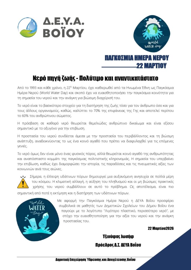 Με αφορμή την Παγκόσμια Ημέρα Νερού η ΔΕΥΑ Βοΐου προσφέρει συμβολικά σε μαθητές των Δημοτικών Σχολείων του Δήμου Βοΐου ένα παγούρι με το λογότυπο “Λιγότερο πλαστικό, περισσότερο νερό”, με στόχο την ευαισθητοποίηση για την αξία του νερού και την ανάγκη προστασίας του.