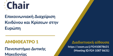 Την Πέμπτη, 13 Οκτωβρίου 2022 και ώρα 12:00 θα πραγματοποιηθεί η πρώτη ενημερωτική εκδήλωση της Έδρα Jean Monnet στην Επικοινωνιακή Διαχείριση Κινδύνου και Κρίσεων στην Ευρώπη. Η εκδήλωση θα πραγματοποιηθεί στο Αμφιθέατρο 1 του Πανεπιστημίου Δυτικής Μακεδονίας στην Καστοριά ενώ θα μεταδίδεται μέσω της πλατφόρμας Zoom: