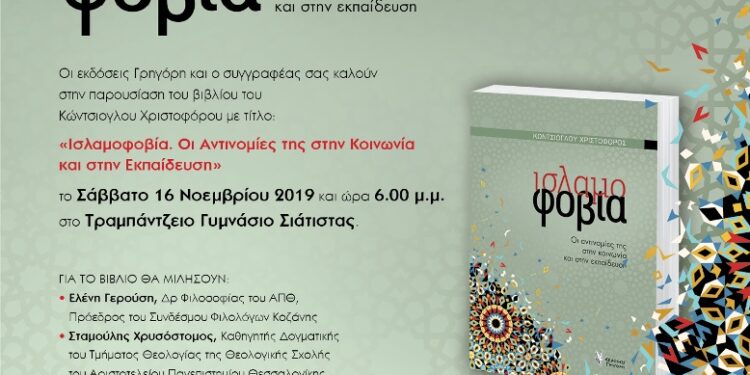 Παρουσίαση του βιβλίου «Ισλαμοφοβία. Οι Αντινομίες της στην Κοινωνία και στην Εκπαίδευση» του Χριστόφορου Κωντσιόγλου το Σάββατο 16 Νοεμβρίου 2019 και ώρα 6.00 μ.μ. στο Τραμπάντζειο Γυμνάσιο Σιάτιστας.