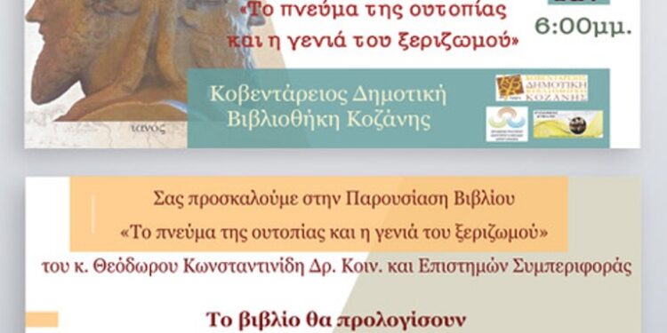 Ο Δήμος Κοζάνης και τα Ποντιακά Σωματεία του Δήμου Κοζάνης σας προσκαλούν στην παρουσίαση του βιβλίου «Το πνεύμα της ουτοπίας και η γενιά του ξεριζωμού», του κ. Θεόδωρου Κωνσταντινίδη, Δρ. Κοιν. και Επιστημών Συμπεριφοράς, τη Δευτέρα 27 Ιανουαρίου, στις 18:00, στην Κοβεντάρειο Δημοτική Βιβλιοθήκη Κοζάνης.