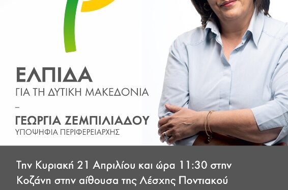 Την Κυριακή 21 Απριλίου 2019 και ώρα 11:30, στην Κοζάνη στην αίθουσα της Λέσχης Ποντιακού Πολιτισμού θα γίνει η παρουσίαση των υποψήφιων Περιφερειακών Συμβούλων καθώς και η ανάλυση των προγραμματικών θέσεων του συνδυασμού Ελπίδα για τη Δυτική Μακεδονία.