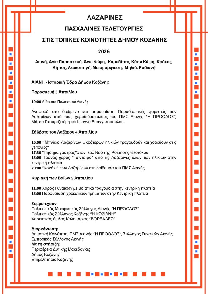 Πασχαλινές Τελετουργίες 2026 στις Τοπικές Κοινότητες του Δήμου Κοζάνης: Αιανή, Αγία Παρασκευή, Άνω Κώμη, Καρυδίτσα, Κάτω Κώμη, Κρόκος, Κήπος, Λευκοπηγή, Μεταμόρφωση, Μηλιά, Ροδιανή