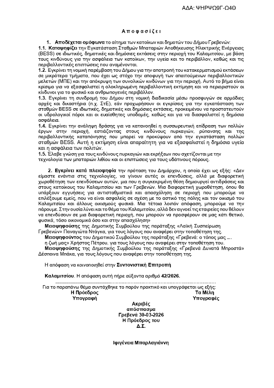 Πράγματι, το Δημοτικό Συμβούλιο, κατά τη συνεδρίαση της 23ης Μαρτίου 2026, αποδέχθηκε ομόφωνα το αίτημα κατοίκων και δημοτών σχετικά με τη μη εγκατάσταση Σταθμών Αποθήκευσης Ηλεκτρικής Ενέργειας (BESS) στην περιοχή του Καλαμιτσίου, εκφράζοντας τις εύλογες ανησυχίες για ζητήματα ασφάλειας, υγείας και περιβαλλοντικών επιπτώσεων.