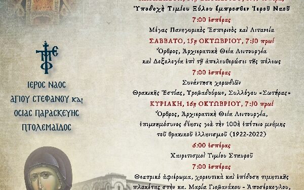 Θὰ χαροῦμε νὰ τιμήσετε μὲ τὴν παρουσία σας τὴν Πανήγυρη τῆς ἐνορίας μας, τὴν ἔλευση τμήματος τοῦ Τιμίου Ξύλου καὶ τὶς λοιπὲς πολιτστικὲς ἐκδηλώσεις ποὺ θὰ πραγματοποιηθοῦν στὸ προαύλιο τοῦ Ναοῦ μας.