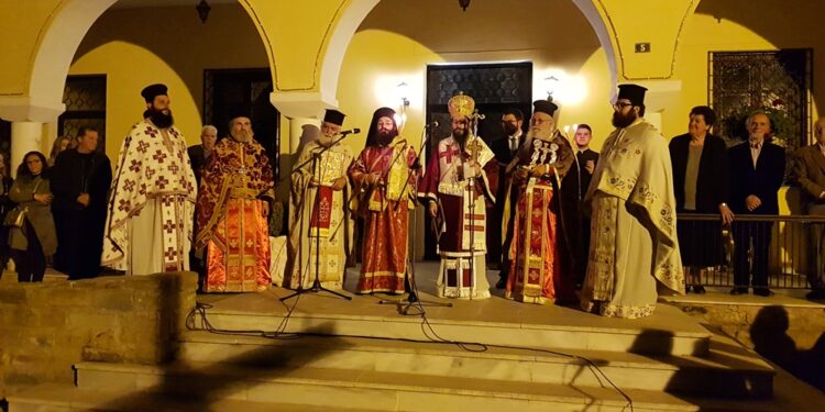 Οι δυο πομπές συναντήθηκαν στο δημαρχείο όπου ο Μητροπολίτης απευθύνθηκε στους πιστούς μες το Πασχαλινό μήνυμα.