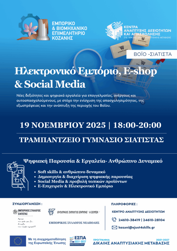 Το Επιμελητήριο Κοζάνης, σε συνεργασία με την ΜΕΤΑΒΑΣΗ Μ.Α.Ε , τον Δήμο Βοΐου, τον Εμπορικό Σύλλογο Σιάτιστας και τον Εμπορικό Σύλλογο Νεάπολης, διοργανώνει εισαγωγικό σεμινάριο με τίτλο: «Ηλεκτρονικό Εμπόριο, E-shop & Social Media».