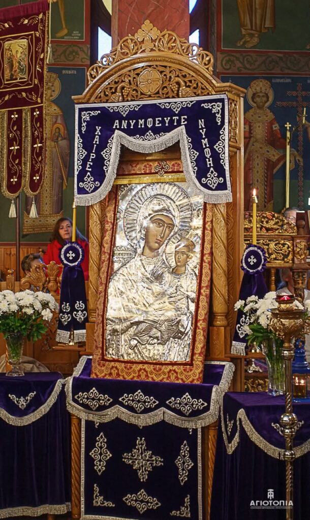 Την Εικόνα της Παναγίας υποδέχθηκαν, ο Σεβ. Μητροπολίτης κ.κ. Αθανάσιος με Ιερείς της Μητυροπόλεως και πλήθος Κόσμου.