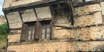 Πρόκειται για το αρχοντικό Τζιουρά στην περιοχή Μπούνος, που όπως βλέπετε στις φωτογραφίες του siera fm ,ξεκόλλησε ολόκληρο κομμάτι από το σαχνισί και έπεσε πάνω στον κάδο απορριμμάτων τον οποίο και έσπασε.