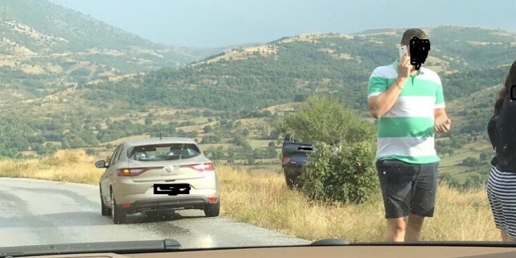Το αυτοκίνητο ντεραπάρισε λόγω της βροχής και τουμπάρισε έξω από το δρόμο, σταματώντας κυριολεκτικά πριν το γκρεμό.