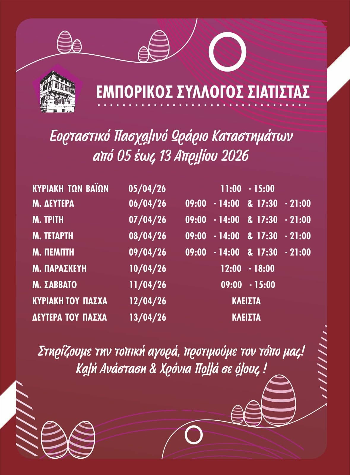 Το εορταστικό ωράριο για το Πάσχα, από τον Εμπορικό Σύλλογο Σιάτιστας