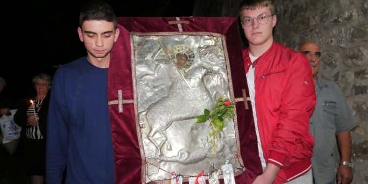 Μετά το πέρας του Πανηγυρικού Εσπερινού στην ιστορική εκκλησία του Αγίου Γεωργίου, χοροστατούντους του Σεβασμιωτάτου Μητροπολίτη Γρεβενών κ.κ.Δαβίδ, τελέστηκε το πατροπαράδοτο έθιμο της περιφοράς της ιεράς εικόνας πέριξ του ναού, με την καθολική και ευλαβική συμμετοχή των παρευρισκομένων.