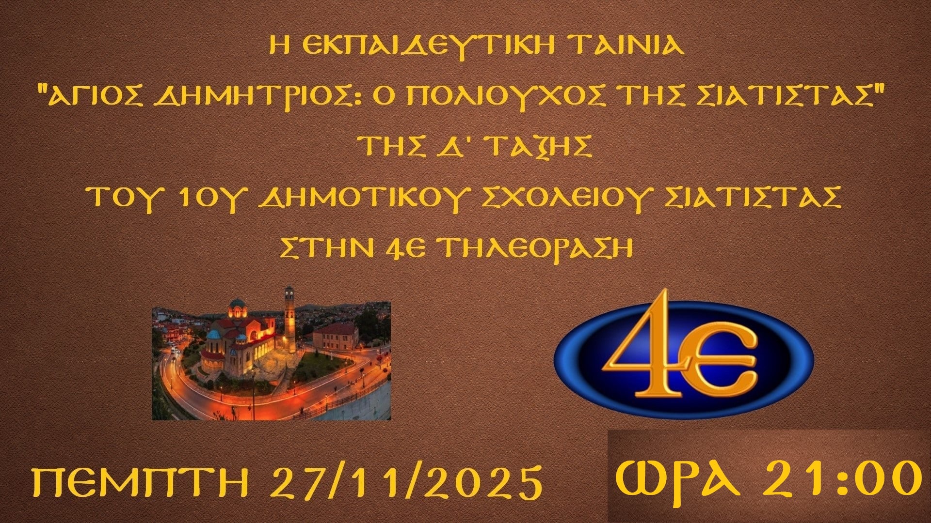 Στον τηλεοπτικό σταθμό 4Ε θα προβληθεί την Πέμπτη 27 Νοεμβρίου 2025 και ώρα 21:00 η εκπαιδευτική ταινία «Άγιος Δημήτριος: Ο Πολιούχος της Σιάτιστας», την οποία δημιούργησαν οι μαθητές και οι μαθήτριες της Δ΄ τάξης του 1ου Δημοτικού Σχολείου Σιάτιστας με τον δάσκαλό τους, Μιχάλη Δούβλο.