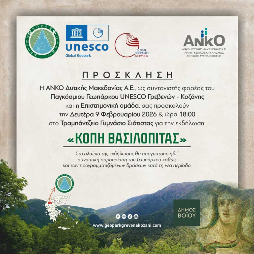Η ΑΝΚΟ Δυτικής Μακεδονίας Α.Ε., ως συντονιστής φορέας του Παγκόσμιου Γεωπάρκου UNESCO Γρεβενών – Κοζάνης και η Επιστημονική ομάδα, σας προσκαλούν την Δευτέρα 9 Φεβρουαρίου 2026 & ώρα 18:00 στο Τραμπάντζειο Γυμνάσιο Σιάτιστας για την εκδήλωση: «ΚΟΠΗ ΒΑΣΙΛΟΠΙΤΑΣ»
