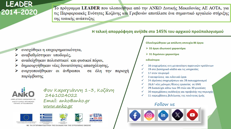 Στο 145% ανήλθε η τελική απορρόφηση του Leader που υλοποιήθηκε από την ΑΝΚΟ σε Κοζάνη και Γρεβενά