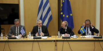 Διακοινοβουλευτική αντιπροσωπεία της Επιτροπής Δημόσιας Διοίκησης, Δημόσιας Τάξης και Δικαιοσύνης της Βουλής των Ελλήνων, αποτελούμενη από τον Πρόεδρο της Επιτροπής κ. Μάξιμο Χαρακόπουλο, τον Γραμματέα της Επιτροπής κ. Στάθη Κωνσταντινίδη και τα μέλη της, κ.κ. Γιώργο Ψυχογιό και Γιώργο Καμίνη, συναντήθηκε με τον Υφυπουργό Μετανάστευσης της Σουηδίας, κ. Anders Hall, στη Βουλή.