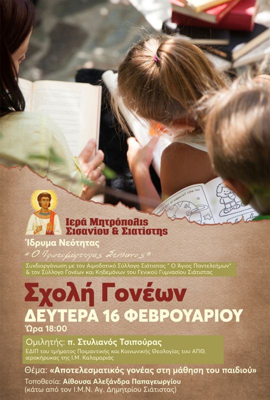 Στα πλαίσια της Σχολής Γονέων της Ιεράς Μητρόπολης Σισανίου και Σιατίστης, θα πραγματοποιηθεί Σύναξη την Δευτέρα 16 Φεβρουαρίου 2026 και ώρα 18:00 στην αίθουσα ”Αλεξάνδρα Παπαγεωργίου” του Ιερού Μητροπολιτικού Ναού Αγίου Δημητρίου πόλεως Σιατίστης.