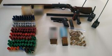 Βρέθηκαν και κατασχέθηκαν πιστόλι, γεμιστήρας, καραμπίνα, 146 φυσίγγια των 9 mm, 162 φυσίγγια κυνηγετικού όπλου, 3 ραδιοασύρματοι και γκλόπ