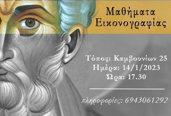 Στα πλαίσια της επανεκκίνησης της ομαλής λειτουργίας του συλλόγου μας, μετά την περίοδο του COVID, αρχίζουμε και πάλι μαθήματα αγιογραφίας. Η πρώτη συνάντηση θα γίνει το Σάββατο 14 Ιανουαρίου 2023 και ώρα 17:30, στα γραφεία του συλλόγου, Καμβουνίων 25.