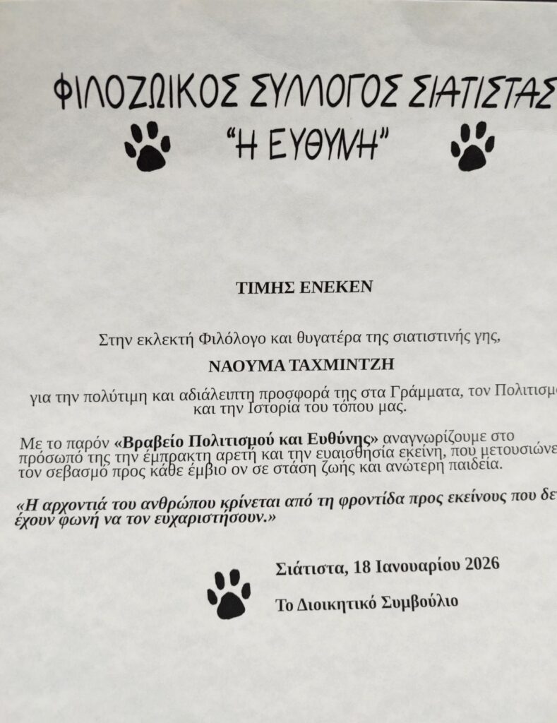 Με ιδιαίτερη συγκίνηση και σεβασμό, ο Φιλοζωικός Σύλλογος Σιάτιστας «Η Ευθύνη» ανακοινώνει την πρώτη βράβευση του θεσμού «Πολιτισμός και Ευθύνη». Τιμούμε την κ. Ναούμα Ταχμιντζή, μια προσωπικότητα που ταυτίζεται με το πνευματικό και ιστορικό ανάστημα του τόπου μας.