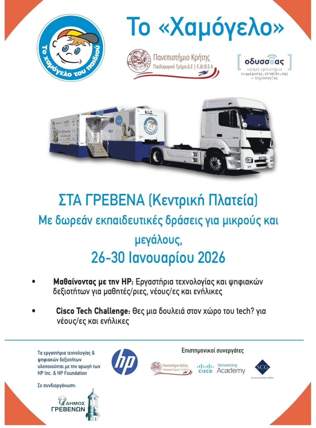 «Το Χαμόγελο του Παιδιού» θα βρεθεί στα Γρεβενά από τις 26 έως και τις 30 Ιανουαρίου 2026, με το Κινητό Εργαστήριο Ενημέρωσης, Εκπαίδευσης και Τεχνολογίας «ΟΔΥΣΣΕΑΣ» και το επιστημονικό προσωπικό του με στόχο την παροχή δωρεάν δράσεων εκπαίδευσης και ενημέρωσης για μικρούς και μεγάλους που εστιάζουν στον ψηφιακό εγγραμματισμό και στα σύγχρονα κοινωνικά ζητήματα.