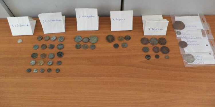 Κατασχέθηκαν 46 αρχαία νομίσματα, τα περισσότερα εκ των οποίων ανήκουν στην ελληνιστική και βυζαντινή περίοδο