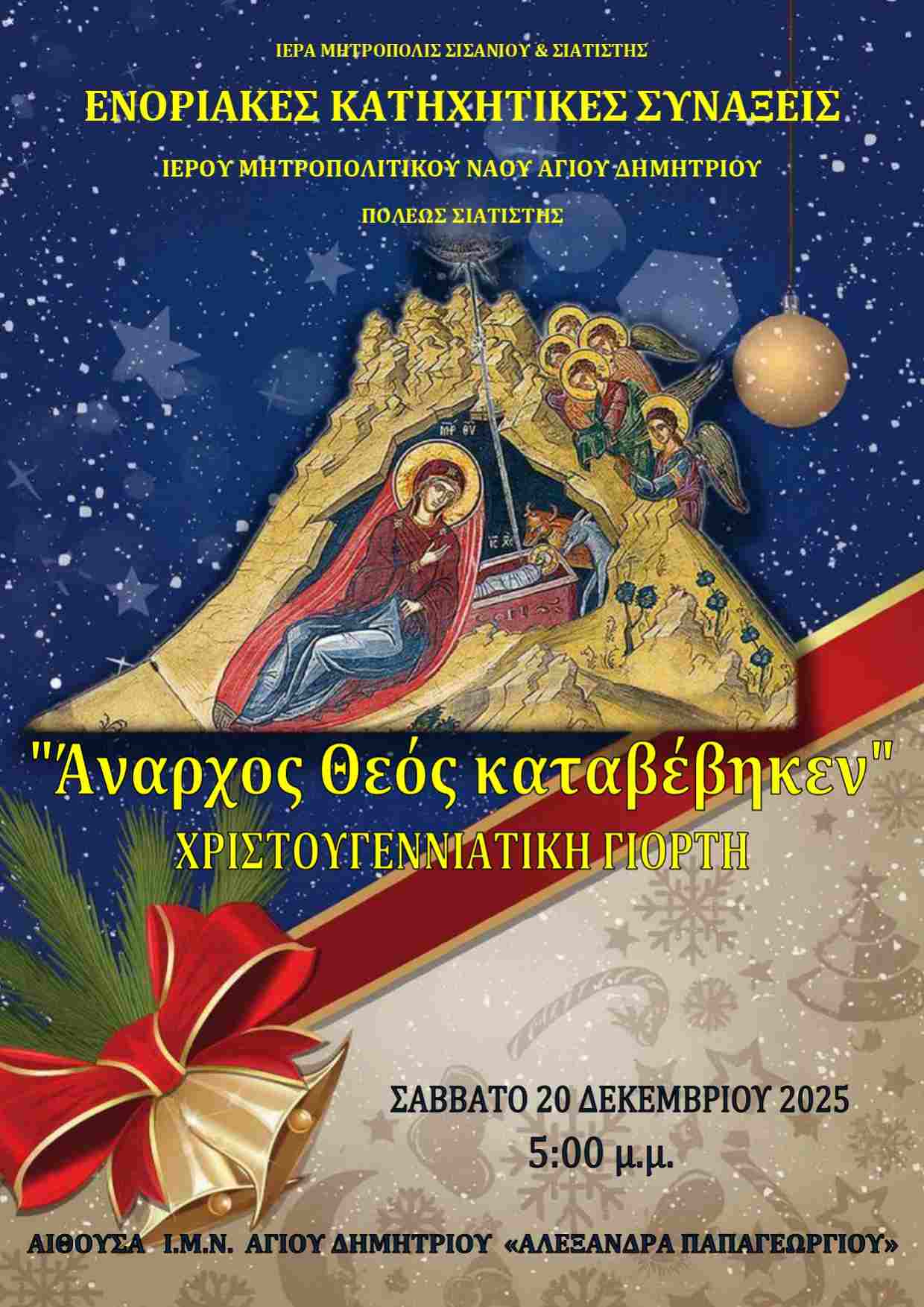 Σας προσκαλούμε στη Χριστουγεννιάτικη γιορτή των Κατηχητικών Συνάξεων της Ενορίας Αγίου Δημητρίου Σιατίστης με τίτλο «Άναρχος Θεός καταβέβηκεν », η οποία θα πραγματοποιηθεί το Σάββατο 20 Δεκεμβρίου και ώρα 5:00 μ.μ. στην αίθουσα «Αλεξάνδρα Παπαγεωργίου