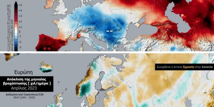 🔵 Στην Ελλάδα η θερμοκρασία τον Απρίλιο του 2023 κυμάνθηκε κατά 1-2°C κάτω από τον μέσο όρο της περιόδου 1991-2020, καταγράφοντας τον πιο ψυχρό Απρίλιο των τελευταίων 10-15 ετών. Αυξημένες βροχοπτώσεις παρατηρήθηκαν στην Βόρεια και Κεντρική Ελλάδα.