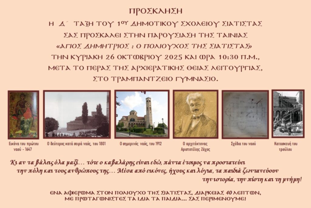 Η Δ΄ Τάξη του 1ου Δημοτικού Σχολείου Σιάτιστας σας προσκαλεί στην παρουσίαση της ταινίας «Άγιος Δημήτριος: Ο Πολιούχος της Σιάτιστας» την Κυριακή 26 Οκτωβρίου 2025 και ώρα 10:30 π.μ., μετά το πέρας της Αρχιερατικής Θείας Λειτουργίας, στο Τραμπάντζειο Γυμνάσιο.