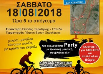 7η Ποδηλατοβόλτα Ξηρολίμνης by sierafm 14 Αυγούστου 2018 0 7η Ποδηλατοβόλτα Ξηρολίμνης το Σαββάτο 18 Αυγούστου 2018 ΩΡΑ 5 το απόγευμα Διοργάνωση : Τοπική Κοινότητα Ξηρολίμνης Μήκος διαδρομής 14 ...