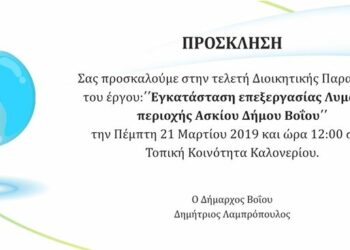 Τελετή Διοικητικής Παραλαβής του έργου : ”Εγκατάσταση επεξεργασίας Λυμάτων περιοχής Ασκίου Δήμου Βοΐου ” by sierafm 20 Μαρτίου 2019 0 Ο Δήμαρχος Βοΐου Δημήτρης Λαμπρόπουλος σας προσκαλεί στην τελετή Διοικητικής Παραλαβής του έργου : ''Εγκατάσταση επεξεργασίας Λυμάτων περιοχής Ασκίου Δήμου ...