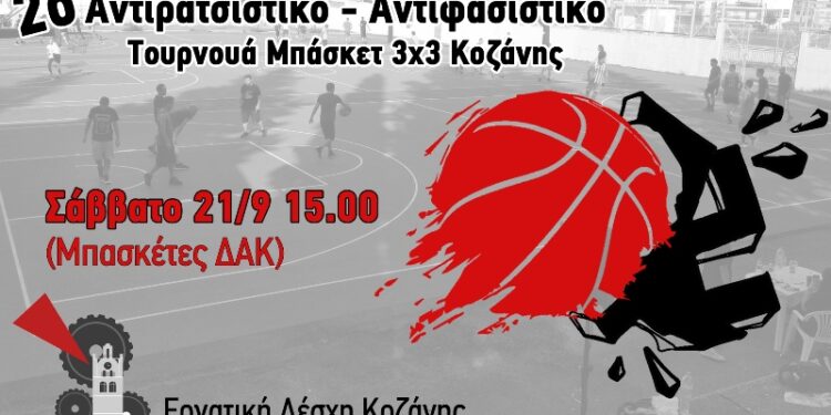 Κάρφωσε τον φασισμό και το σύστημα που τον γεννά και τον θρέφει!Η εργατική λέσχη Κοζάνης σας προσκαλεί σε μια αντιφασιστική – αντιρατσιστική γιορτή αθλητισμού! Το Σάββατο 21/9 στις 3 το μεσημέρι σας καλούμε όλους και όλες στο 2o αντιφασιστικό – αντιρατσιστικό τουρνουά μπάσκετ 3×3 που θα πραγματοποιηθεί στα εξωτερικά γήπεδα μπάσκετ του ΔΑΚ (Δημοτικό Αθλητικό Κέντρο) Κοζάνης.