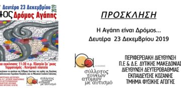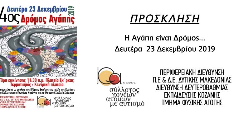 Η Διεύθυνση Δευτεροβάθμιας Εκπαίδευσης Κοζάνης σε συνεργασία με το Σύλλογο Γονέων, Κηδεμόνων & Φίλων Παιδιών με Αυτισμό Κοζάνης, διοργανώνει τον 4ο Δρόμο Αγάπης, την Δευτέρα, 23-12-2019, στις 11:30 π.μ.