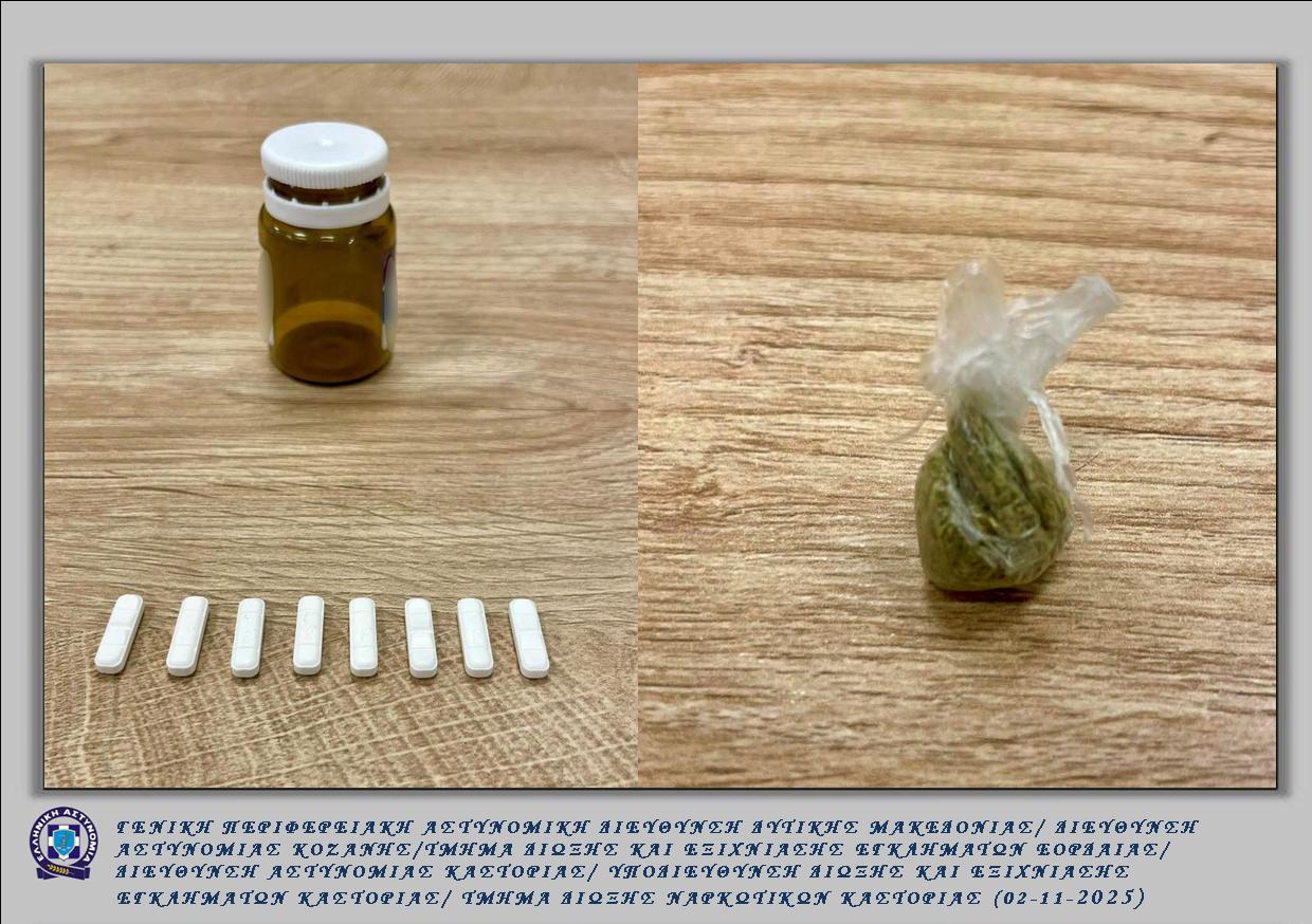 Στην δεύτερη περίπτωση, συνελήφθη την 31-10-2025 τις μεσημβρινές ώρες στην πόλη της Καστοριάς, από αστυνομικούς του Τμήματος Δίωξης Ναρκωτικών της Υποδιεύθυνσης Δίωξης και Εξιχνίασης Εγκλημάτων Καστοριάς, 44χρονος ημεδαπός, διότι στην κατοχή του βρέθηκαν και κατασχέθηκαν -8- δισκία χαπιών που εμπίπτουν στις διατάξεις περί εξαρτησιογόνων ουσιών, την κατοχή των οποίων δεν μπόρεσε να δικαιολογήσει, τα οποία προμηθεύτηκε σε προγενέστερο χρόνο από έτερο 44χρονο ημεδαπό, σε βάρος του οποίου σχηματίσθηκε δικογραφία κακουργηματικού χαρακτήρα για διακίνηση ναρκωτικών.
