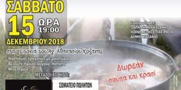 Μετά την περσινή μεγάλη επιτυχία και το αγκάλιασμα του κόσμου διοργανώνεται και φέτος το Σάββατο και την Κυριακή 15 και 16 Δεκεμβρίου 2018 από τον Πολιτιστικό Σύλλογο Αγ. Αθανασίου Κοζάνης, το 6ο Φεστιβάλ Παραδοσιακής Σούπας Αγ. Αθανασίου Κοζάνης (6th Traditional Soup Festival of Kozani).