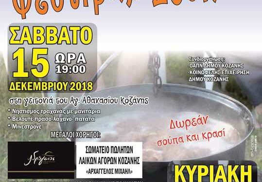 Την Κυριακή 16 Δεκεμβρίου 2018 από τις 10.00 ώρα το πρωί το 6ο Φεστιβάλ Παραδοσιακής Σούπας μεταφέρεται για πρώτη φορά στην Κεντρική Πλατεία της Κοζάνης, όπου θα προσφερθούν η παραδοσιακή φασολάδα με τοπικά όσπρια, σούπα βελουτέ μπρόκολο – κουνουπίδι με λαχανικά από παραγωγούς της περιοχής και η γευστική μανιταρόσουπα, μαζί με εκλεκτό κρασί.