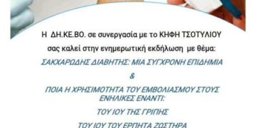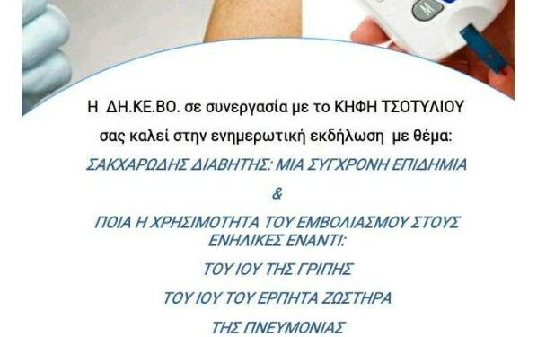 Η ΔΗ.ΚΕ.ΒΟ. σε συνεργασία με το ΚΗΦΗ Τσοτυλίου σας καλεί στην ενημερωτική εκδήλωση με θέμα: Σακχαρώδης Διαβήτης: μια σύγχρονη επιδημία και ποια η χρησιμότητα του εμβολιασμού στους ενήλικες έναντι του ιού της γρίπης, του ιού του έρπητα και της πνευμονίας.