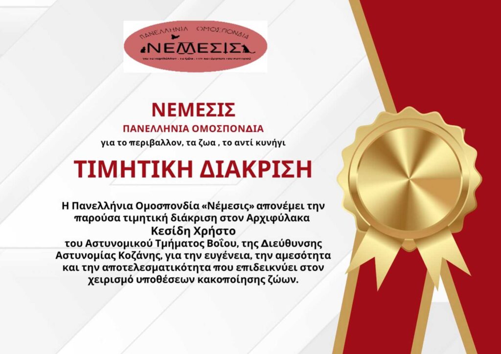 Ο Φιλοζωικός Σύλλογος Σιάτιστας “Η Ευθύνη” συγχαίρει θερμά τους Αρχιφύλακες του Αστυνομικού Τμήματος Βοΐου Κεσίδη Χρήστο και Πατσάκα Κωνσταντίνο για τη βράβευση τους από την “Πανελλήνια Ομοσπονδία για το περιβάλλον, τα ζώα, το κυνήγι – ΝΕΜΕΣΙΣ”.