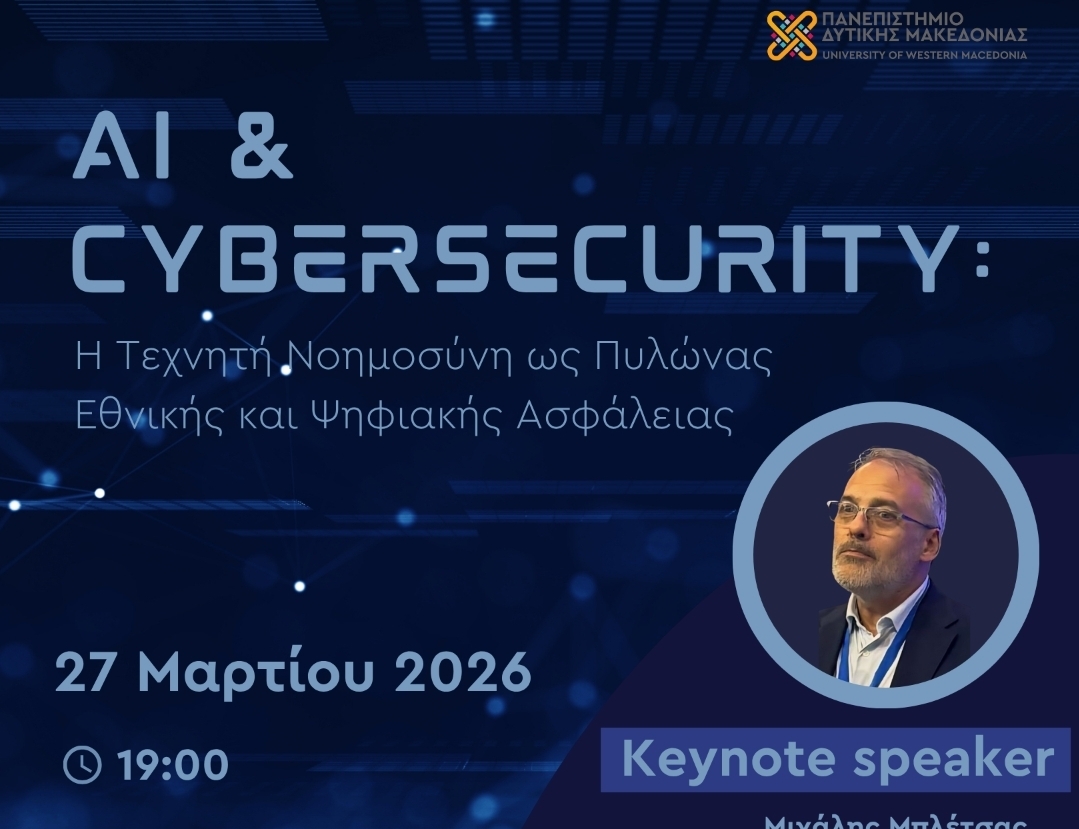 Σε μια εποχή όπου η τεχνητή νοημοσύνη εξελίσσεται ραγδαία, η ασφάλεια και η αξιοπιστία των ψηφιακών συστημάτων τίθενται στο επίκεντρο. Σε αυτό το πλαίσιο, το Πανεπιστήμιο Δυτικής Μακεδονίας διοργανώνει την εκδήλωση «AI & Cybersecurity: Η Τεχνητή Νοημοσύνη ως Πυλώνας Εθνικής και Ψηφιακής Ασφάλειας», την Παρασκευή 27 Μαρτίου 2026, στις 19:00, στο Αμφιθέατρο του Κτηρίου Διοίκησης, στην Πανεπιστημιούπολη ΖΕΠ Κοζάνης.